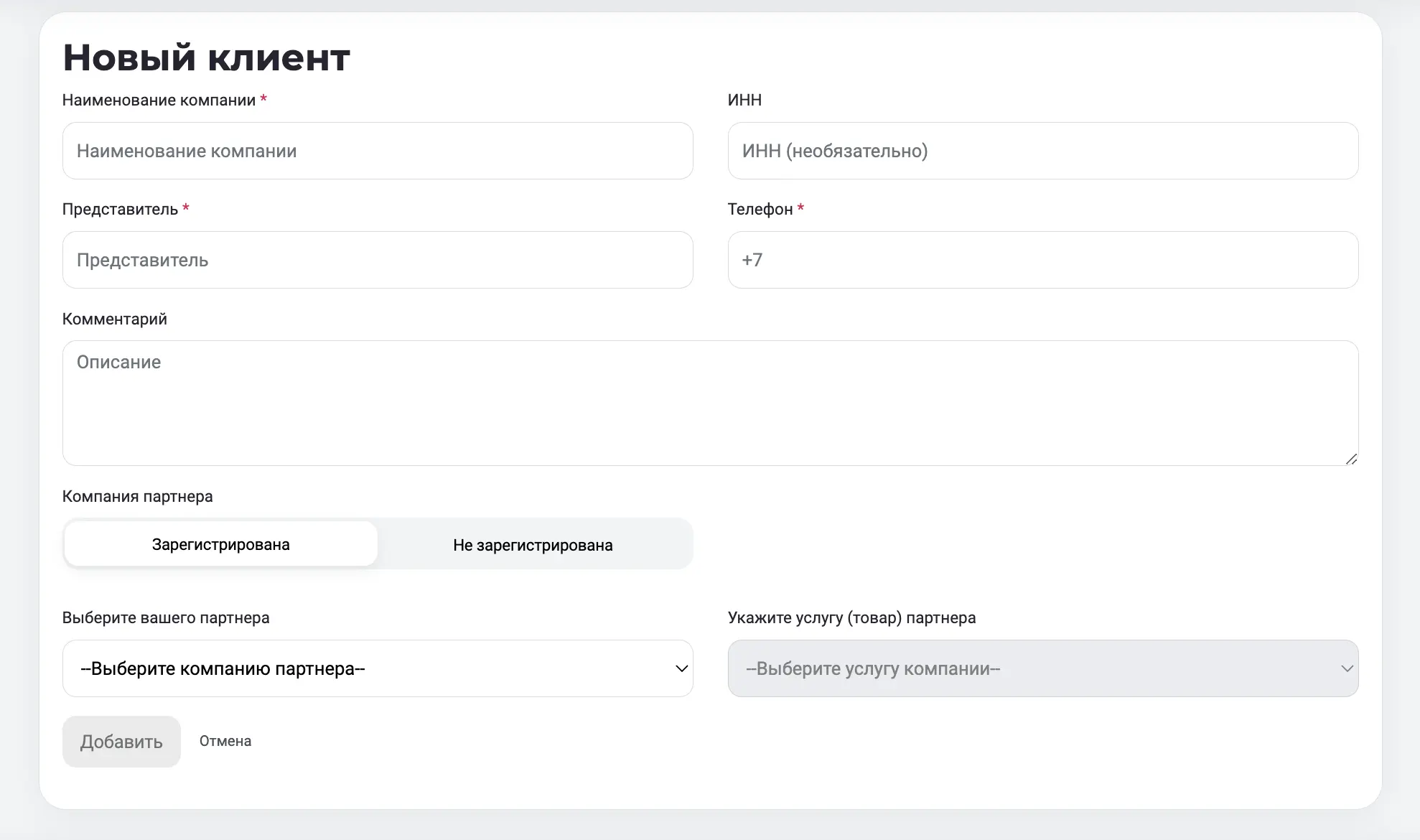 Если компания-партнер не зарегистрирована на платформе Сдельно укажите это, выбрав пункт "Компания не зарегистрирована". В этом случае клиент (лид) попадает в статус "Не прикреплен". ![]()